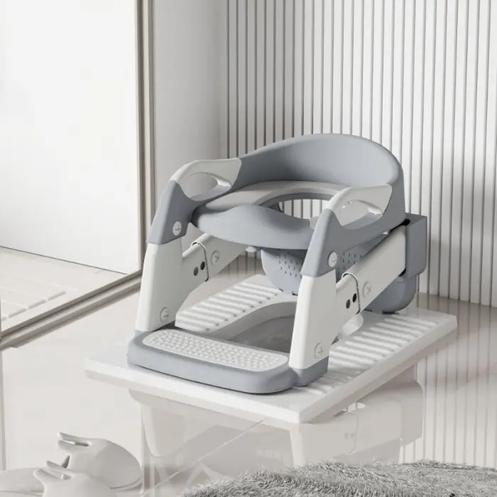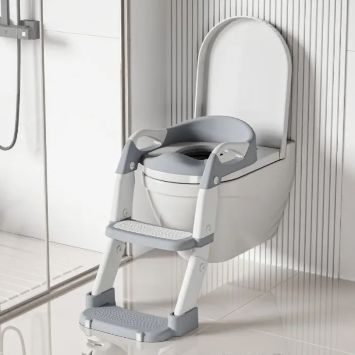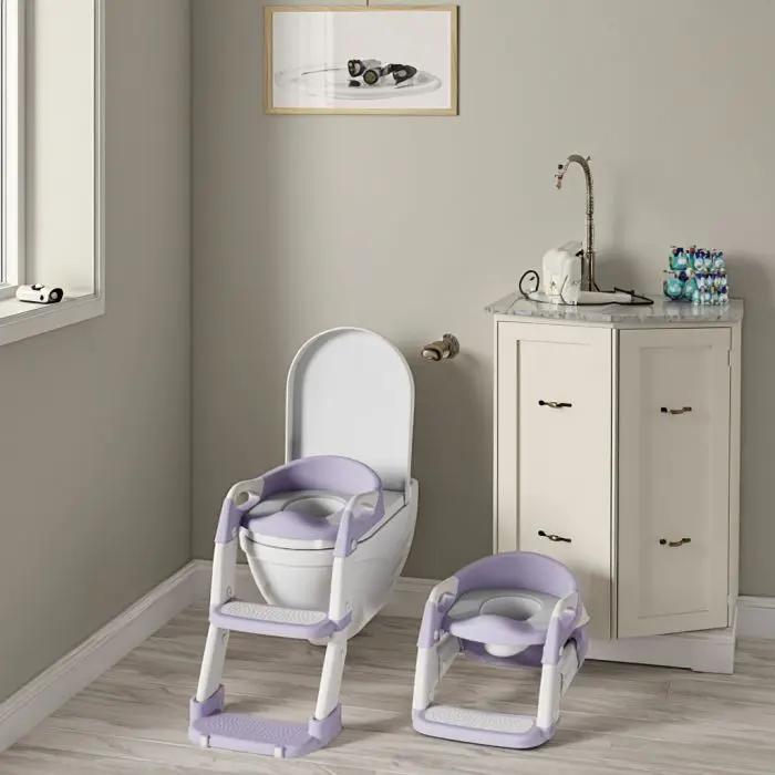 Descripción Accesorio de baño infantil 2 en 1Reductor c/ Escalera + pelelaColores Gris/blanco y Lila/blanco.