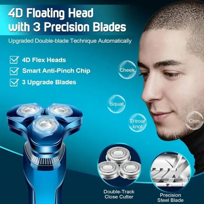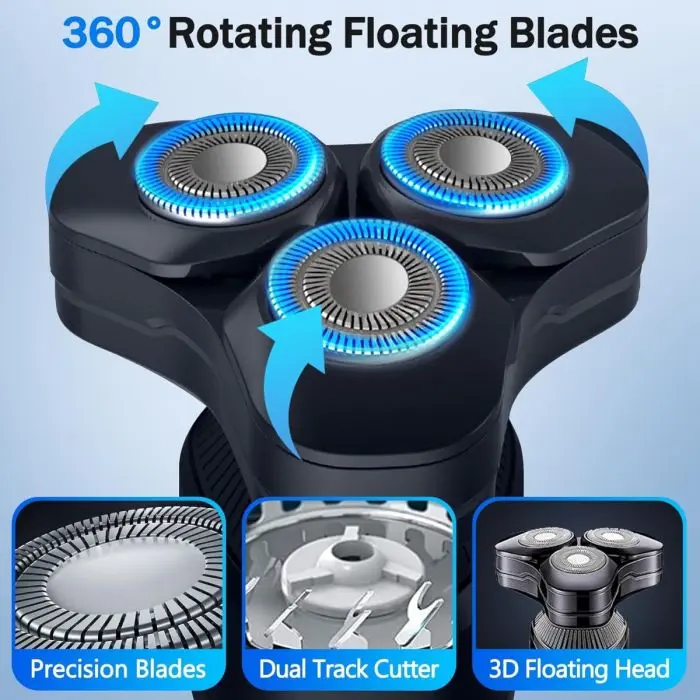 Cortador de doble pista y cabezal flotante 4D: la red de corte de doble pista y la hoja de acero afilada hacen que el área y el número de entrada de barba de la afeitadora se dupliquen, optimizando el tiempo de afeitado. El cabezal flotante 4D se adapta automáticamente a los contornos de tu rostro y cuello, incluso a la línea de la mandíbula, para proporcionar un afeitado apurado y suave. Simplemente acerque el cuerpo de la afeitadora a su cara y se alinearán automáticamente gracias a la inducción magnética.