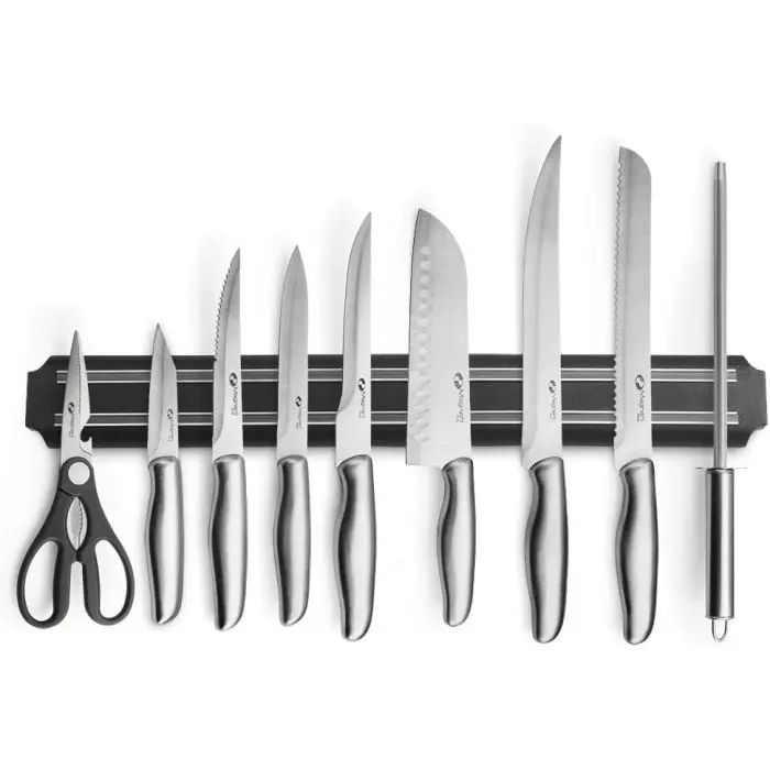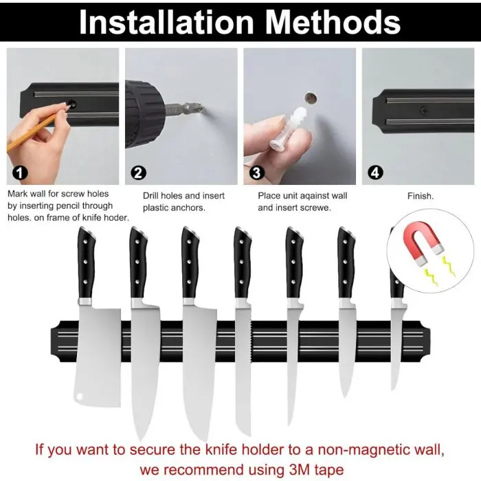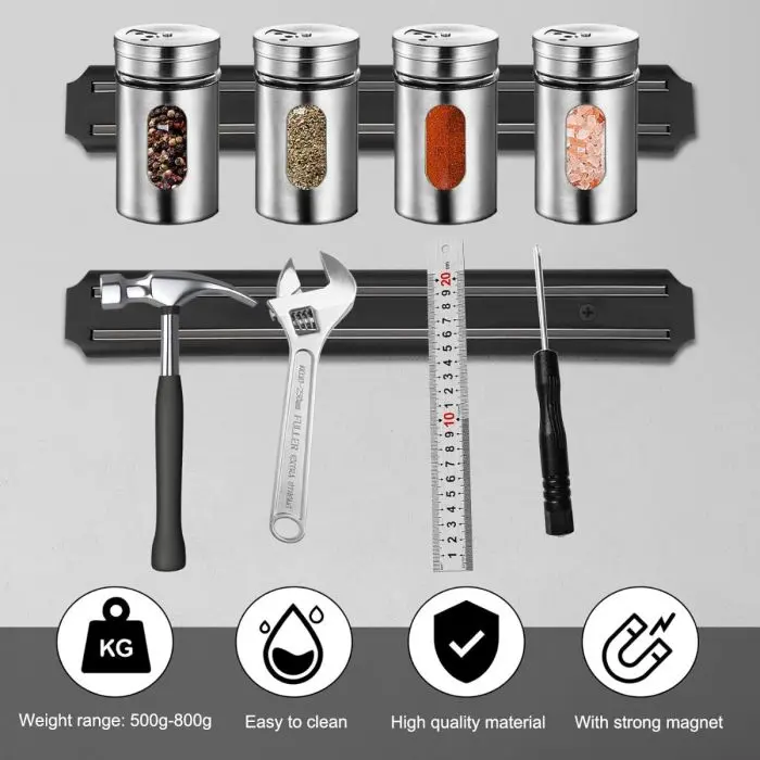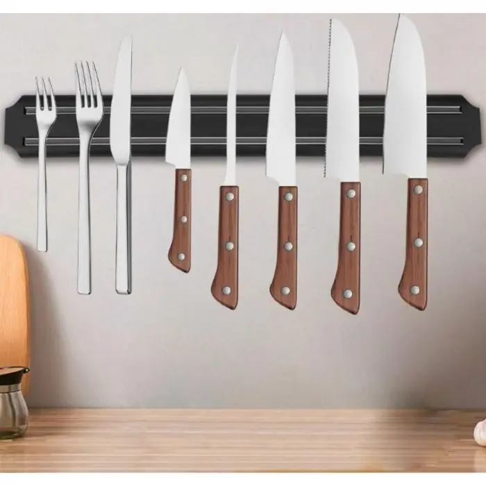 Descripción - Barra imantada magnética para cuchillos/herramientas- Medidas: 55x5cm- Incluye tornillos y tarugos para fijarlo