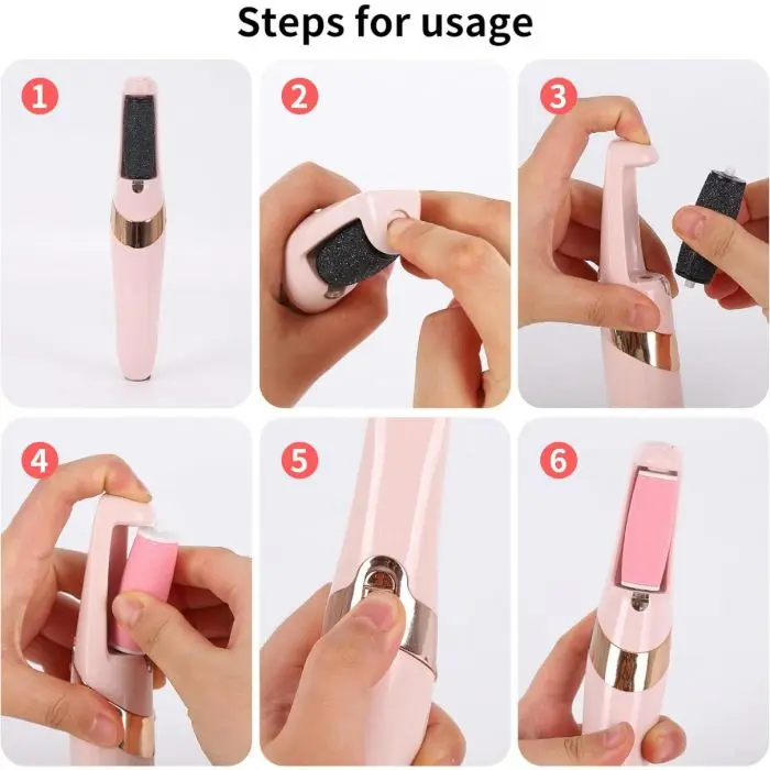 2. Coloque el rodillo de lima en el área que necesita para exfoliar y muévalo lentamente sobre la piel. Presione el botón de encendido para apagar el aparato después de usarlo. Limpie los residuos restantes de los pies.