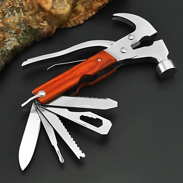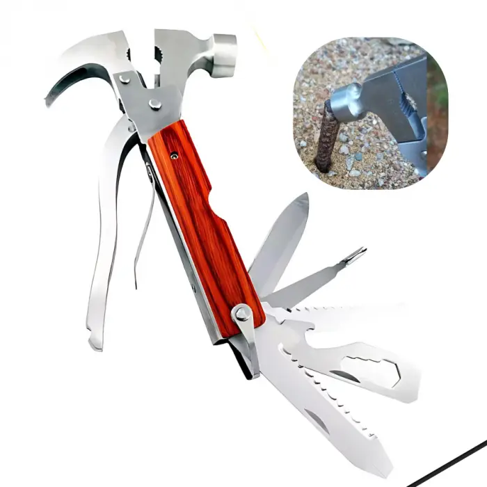 Funciones: Martillo - Pinza - Alicate - Destornillador plano y philips - Navaja - Serrucho - Cuchilla dentada - Lima - Llave multimedida para tuercas - Destapador - Saca clavos .