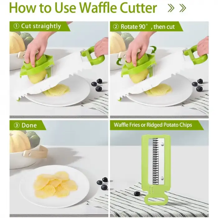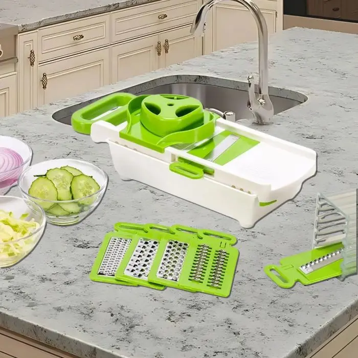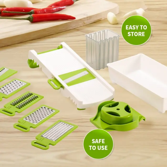 Fácil de usar: la cortadora está equipada con una base de contenedor de alimentos antideslizante, que puede almacenar las verduras y frutas cortadas en categorías, reduciendo el desorden en la tabla de cortar de la cocina, de modo que a veces ni siquiera necesita una tabla de cortar.