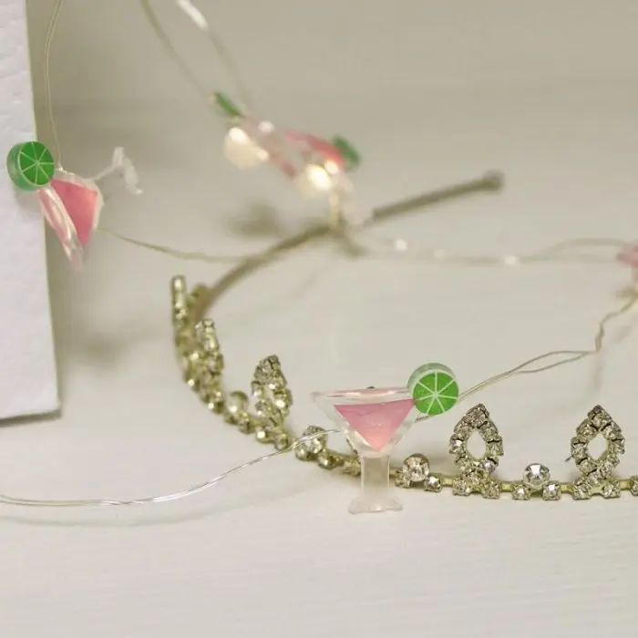Descripción Tira de luz con mini cocktails de 1 metro de largo aproximadamente.Funciona con 2 pilas AA. No incluye las pilas.